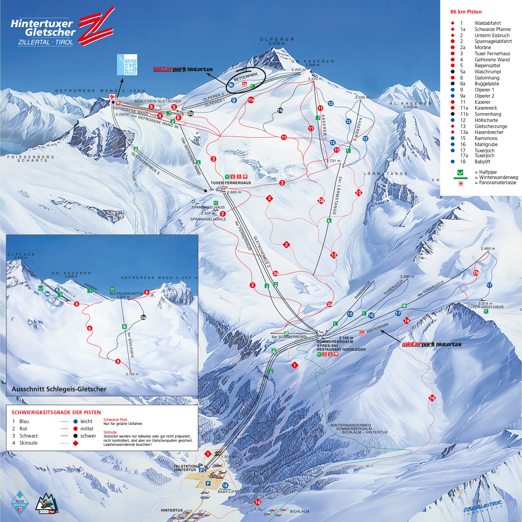 Hintertuxer GletscherHöhe: 1500 m - 3250 m Pisten: 86 km Skilifte: 21 Pistenplan: Hintertuxer Gletscher Schneesicherheit alle Gebiete: Dezember bis April Gletscher: ganzjähriger Skilaufbetrieb Langlauf 200 km gespurte Loipen Pistenplan Zillertal Gesamtansicht Das Zillertal bietet eine Ansammlung von zehn kleinen und mittelgroßen Skigebieten mit insgesamt über 600 Pistenkilometern. Durch neue Verbindungslifte sind verschiedene Skischaukeln entstanden, die ein großräumiges "Ski-Cruising " ermöglichen. Ein lückenloser, kostenfreier Skibusservice sorgt für eine sehr gute Verknüpfung dieser Teilregionen. Der ADAC vergibt maximale 5 Sterne und das Prädikat "garantiert schneesicher". Skipass